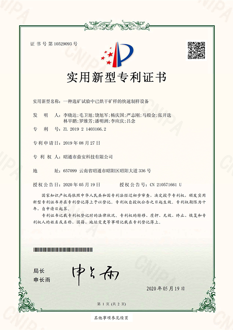 10529093一種選礦試驗中已烘干匡洋的快速制樣設備20200519實用新型專利證書